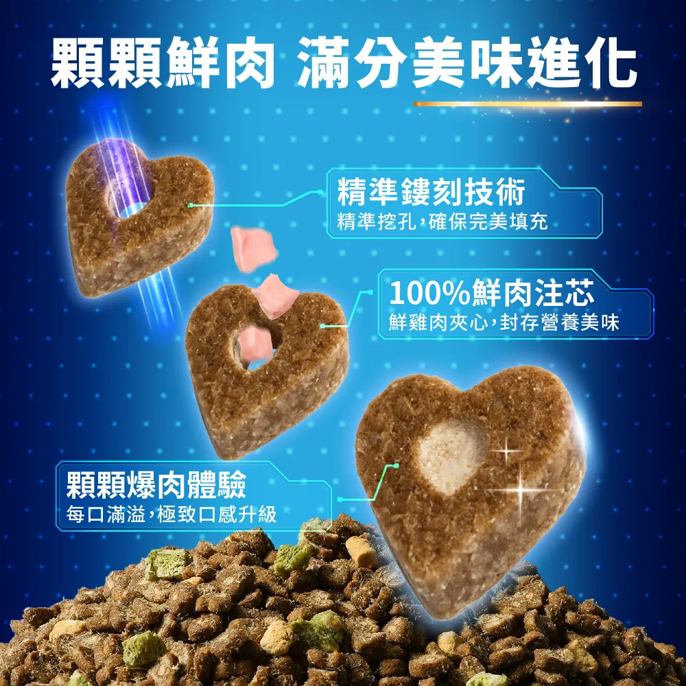 ▸ 100%鮮肉夾心:夾入鮮香雞肉凍乾,美味進化