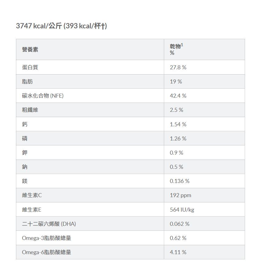雞肉、糙米、全穀粒小麥、雞肉粉、雞脂肪、全穀粒玉米、全穀粒燕麥、豌豆蛋白、黃豆粉、水解雞香料、胡桃殼粉、磷酸二鈣、乳酸、豬肝香料、黃豆油、碘鹽、亞麻仁籽、脫水甜菜漿、脫水柑橘漿、氯化鉀、魚油、氯化膽鹼、壓萃蔓越莓、維生素 (維生素E添加劑、抗壞血酸多聚磷酸酯(維生素C來源)、菸鹼酸添加劑、硝酸硫胺(維生素B1)、維生素A添加劑、泛酸鈣、核黃素添加劑、生物素、維生素B12添加劑、維生素B6、葉酸、維生素D3添加劑)、左旋蘇胺酸、DL-蛋胺酸、礦物質 (硫酸亞鐵、氧化鋅、硫酸銅、氧化錳、碘酸鈣、亞硒酸鈉)、牛磺酸、添加綜合維生素E類以保鮮、天然香料、左旋色胺酸、β-胡蘿蔔素