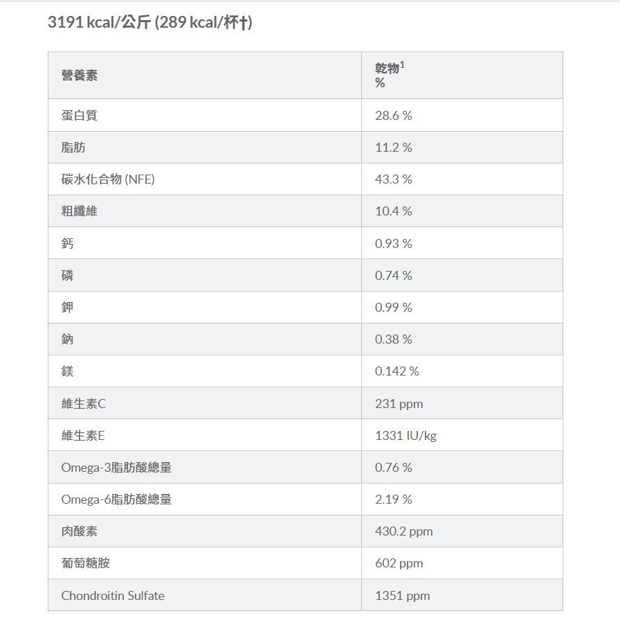 原料:雞肉、碎珍珠大麥、糙米、豌豆纖維、玉米筋質粉、雞肉粉、脫水番茄粕、燕麥纖維、胡蘿蔔、雞肝香料、亞麻仁籽、脫水甜菜漿、椰子油、豬肝香料、乳酸、氯化鉀、左旋離胺酸、DL-蛋胺酸、碘鹽、硫辛酸、維生素 (維生素E添加劑、抗壞血酸多聚磷酸酯(維生素C來源)、菸鹼酸添加劑、硝酸硫胺(維生素B1)、維生素A添加劑、泛酸鈣、核黃素添加劑、生物素、維生素B12添加劑、維生素B6、葉酸、維生素D3添加劑)、氯化膽鹼、礦物質 (硫酸錳、硫酸亞鐵、氧化鋅、硫酸銅、碘酸鈣、亞硒酸鈉)、牛磺酸、添加綜合維生素E類以保鮮、天然香料、左旋肉酸素、β-胡蘿蔔素、蘋果、青花菜、蔓越莓、綠豌豆