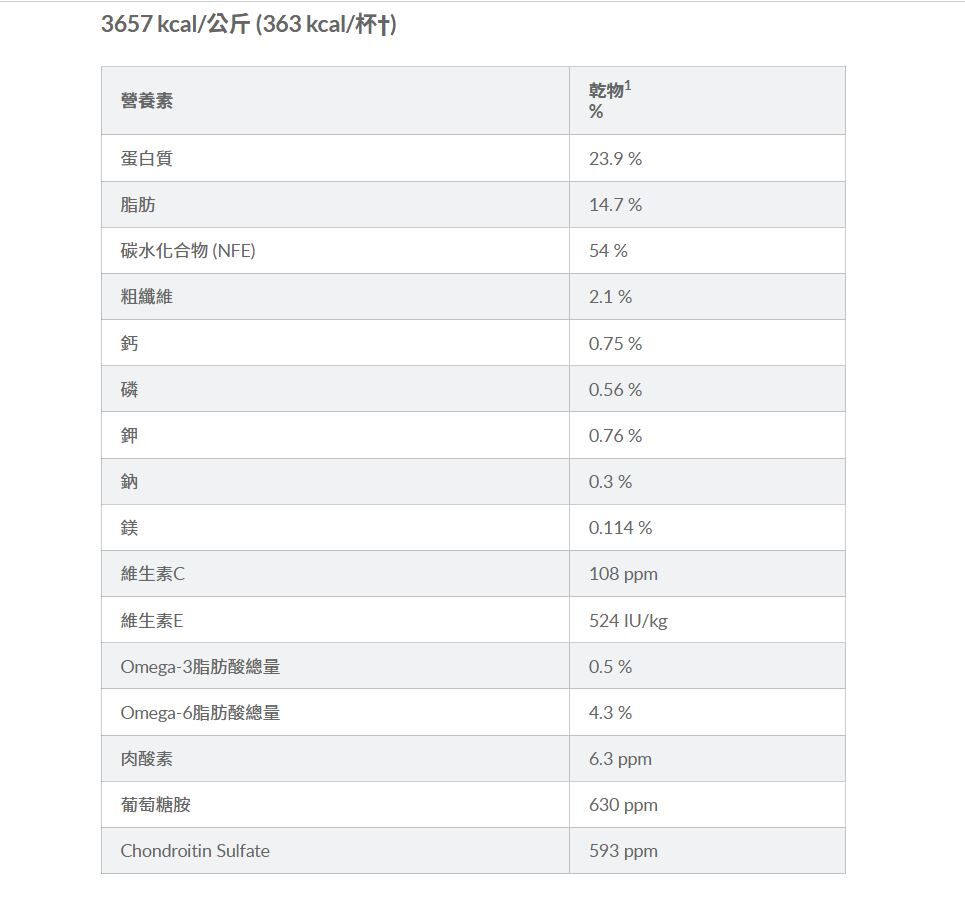 原料:雞肉、碎珍珠大麥、全穀粒小麥、全穀粒玉米、全穀粒高粱、玉米筋質粉、黃豆粉、雞脂肪、雞肝香料、釀造米、雞肉粉、脫水甜菜漿、黃豆油、乳酸、豬肝香料、碳酸鈣、亞麻仁籽、氯化鉀、氯化膽鹼、碘鹽、維生素 (維生素E添加劑、抗壞血酸多聚磷酸酯(維生素C來源)、菸鹼酸添加劑、硝酸硫胺(維生素B1)、維生素A添加劑、泛酸鈣、生物素、維生素B12添加劑、核黃素添加劑、維生素B6、葉酸、維生素D3添加劑)、牛磺酸、礦物質 (硫酸亞鐵、氧化鋅、硫酸銅、氧化錳、碘酸鈣、亞硒酸鈉)、燕麥纖維、添加綜合維生素E類以保鮮、天然香料、β-胡蘿蔔素、蘋果、青花菜、胡蘿蔔、蔓越莓、綠豌豆