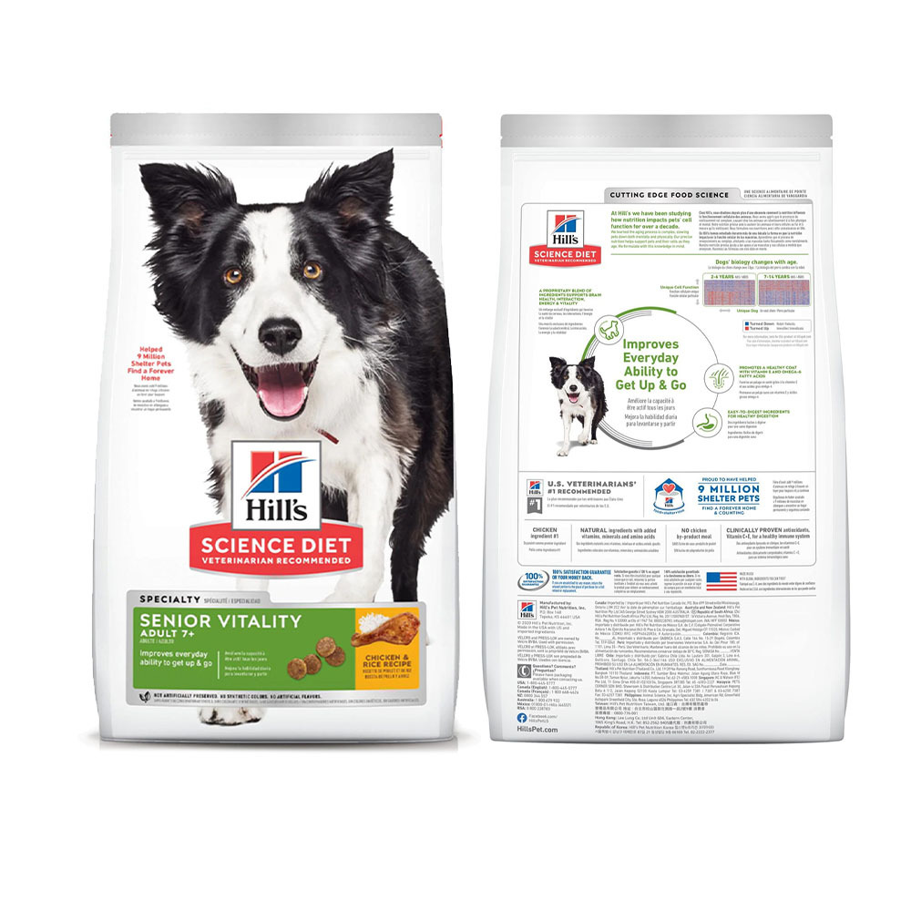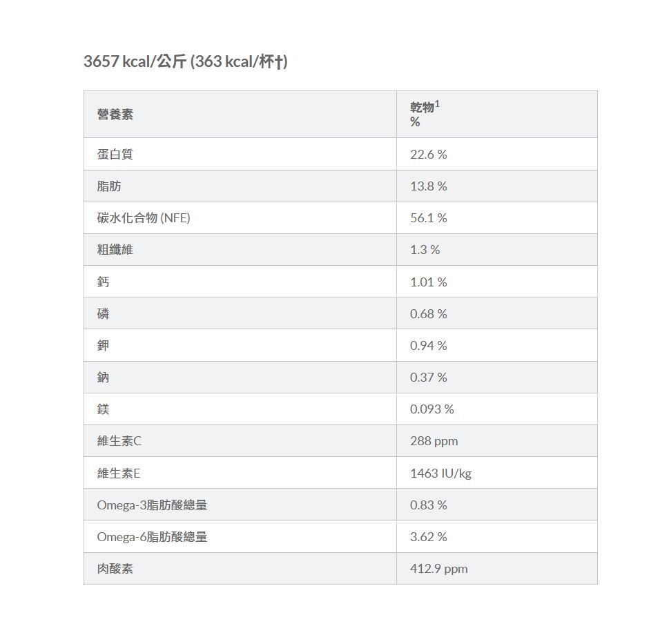 雞肉、釀造米、黃豌豆、碎珍珠大麥、全穀粒燕麥、全穀粒玉米、蛋製品、雞脂肪、雞肝香料、玉米筋質粉、黃豆油、亞麻仁籽、豬肝香料、乳酸、左旋離胺酸、氯化鉀、碳酸鈣、磷酸二鈣、胡蘿蔔、脫水番茄粕、脫水柑橘漿、菠菜、魚油、碘鹽、硫辛酸、維生素(維生素E添加劑、抗壞血酸多聚磷酸酯(維生素C來源)、菸鹼酸添加劑、硝酸硫胺(維生素B1)、維生素A添加劑、泛酸鈣、核黃素添加劑、生物素、維生素B12添加劑、維生素B6、葉酸、維生素D3添加劑)、氯化膽鹼、牛磺酸、礦物質(硫酸亞鐵、氧化鋅、硫酸銅、氧化錳、碘酸鈣、亞硒酸鈉)、天然香料、左旋色胺酸、添加綜合維生素E類以保鮮、左旋肉酸素、Β-胡蘿蔔素