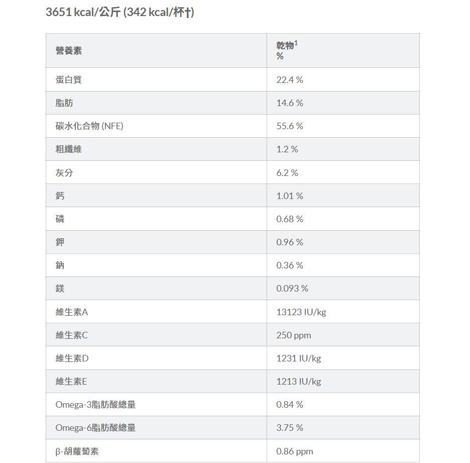 原料:雞肉、釀造米、黃豌豆、碎珍珠大麥、全穀粒燕麥、全穀粒玉米、蛋製品、雞脂肪、雞肝香料、玉米筋質粉、黃豆油、亞麻仁籽、豬肝香料、乳酸、左旋離胺酸、氯化鉀、碳酸鈣、磷酸二鈣、胡蘿蔔、脫水番茄粕、脫水柑橘漿、菠菜、魚油、碘鹽、硫辛酸、維生素 (維生素E添加劑、抗壞血酸多聚磷酸酯(維生素C來源)、菸鹼酸添加劑、硝酸硫胺(維生素B1)、維生素A添加劑、泛酸鈣、核黃素添加劑、生物素、維生素B12添加劑、維生素B6、葉酸、維生素D3添加劑)、氯化膽鹼、牛磺酸、礦物質 (硫酸亞鐵、氧化鋅、硫酸銅、氧化錳、碘酸鈣、亞硒酸鈉)、天然香料、左旋色胺酸、添加綜合維生素E類以保鮮、左旋肉酸素、β-胡蘿蔔素