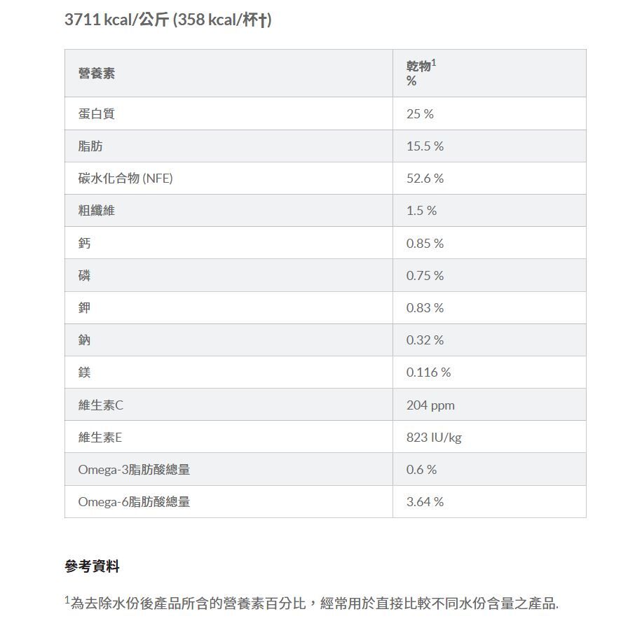 雞肉、糙米、全穀粒小麥、全穀粒玉米、釀造米、雞肉粉、全穀粒高粱、雞脂肪、黃豆粉、雞肝香料、玉米筋質粉、豬肝香料、亞麻仁籽、乳酸、黃豆油、氯化鉀、左旋離胺酸、碘鹽、維生素 (維生素E添加劑、抗壞血酸多聚磷酸酯(維生素C來源)、菸鹼酸添加劑、硝酸硫胺(維生素B1)、維生素A添加劑、泛酸鈣、核黃素添加劑、生物素、維生素B12添加劑、維生素B6、葉酸、維生素D3添加劑)、南瓜、氯化膽鹼、DL-蛋胺酸、碳酸鈣、牛磺酸、礦物質 (硫酸亞鐵、氧化鋅、硫酸銅、氧化錳、碘酸鈣、亞硒酸鈉)、添加綜合維生素E類以保鮮、天然香料、左旋肉酸素、β-胡蘿蔔素