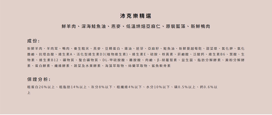 新鮮羊肉、羊肉茸、鴨肉、養生糙米、燕麥、黃豆精蛋白、雞油、胚芽、亞麻籽、鮭魚油、新鮮蔓越莓乾、甜菜醬、氯化物、抗壞血酸、維生素A、活化型維生素D3(植物維生素)、維生素E、硫胺素(維生素B1)、核黃素(維生素B2)、菸鹼酸(維生素B3)、泛酸鈣(維生素B5)、維生素B6、葉酸(維生素B9)、生物素(維生素H)、維生素B12、有機礦物質、綜合礦物質、DL-甲硫胺胺、離胺酸、肉鹼、B-胡蘿蔔素、益生菌、脂肪分解酵素、澱粉分解酵素、蛋白酵素、纖維酵素、蔬菜及水果酵素、海藻萃取物、絲蘭萃取物、鯊魚軟骨素。
