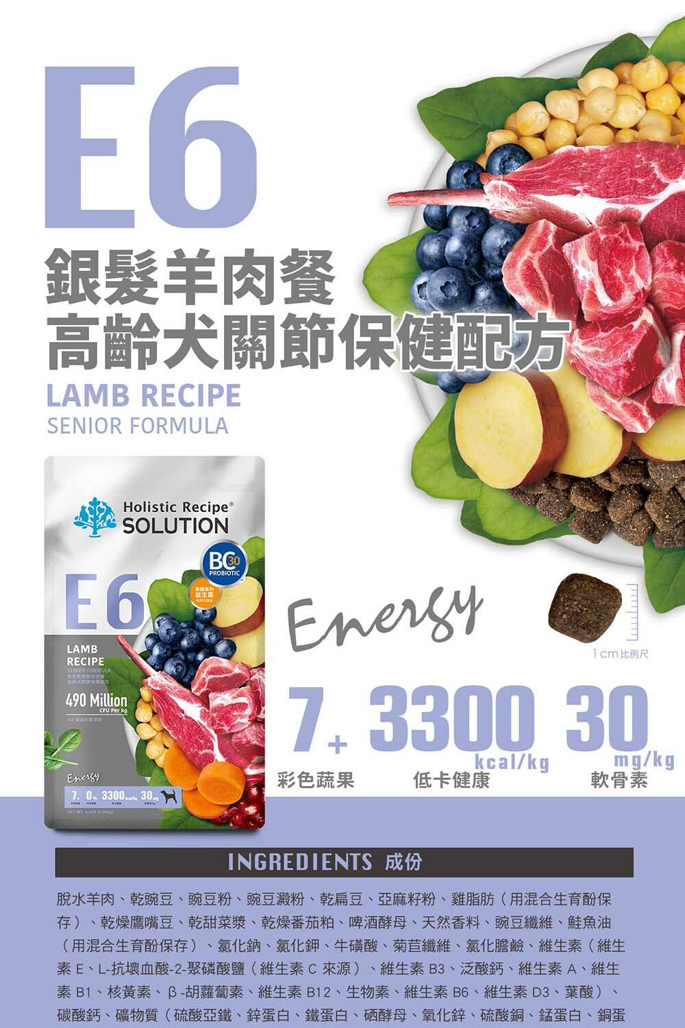 羊肉粉,豌豆乾,豌豆粉,豌豆澱粉,扁豆乾,亞麻籽仁,雞油(以混合生育酚儲存),甘藷乾,羊鮮肉,甜菜根乾,天然風味劑,蕃茄粕乾,啤酒酵母,豌豆纖維素,鮭魚油(以混合生育酚儲存),食鹽,氯化鉀,牛磺酸,菊苣根乾(菊糖與果寡糖來源),氯化膽鹼,維生素(維生素E,抗壞血酸(維生素C來源),菸鹼酸,泛酸鈣,維生素A,硫胺素單硝酸鹽,核黃素,Beta胡蘿蔔素,維生素B12,生物素,氫氯化吡哆醇,維生素D3,葉酸),礦物質(硫酸亞鐵,蛋白質螯合鋅,蛋白質螯合鐵,亞硒酸鈉,氧化鋅,硫酸銅,蛋白質螯合錳,蛋白質螯合銅,氧化錳,碘酸鈣),蛋氨酸,海藻乾,綠唇貝,菠菜乾,胡蘿蔔乾,蘋果乾,藍莓乾,蔓越莓乾,綠茶抽出物,維生素C多磷酸鹽(維生素C來源),蕬蘭精華,鹽酸鹽葡萄糖胺,硫酸軟骨素。