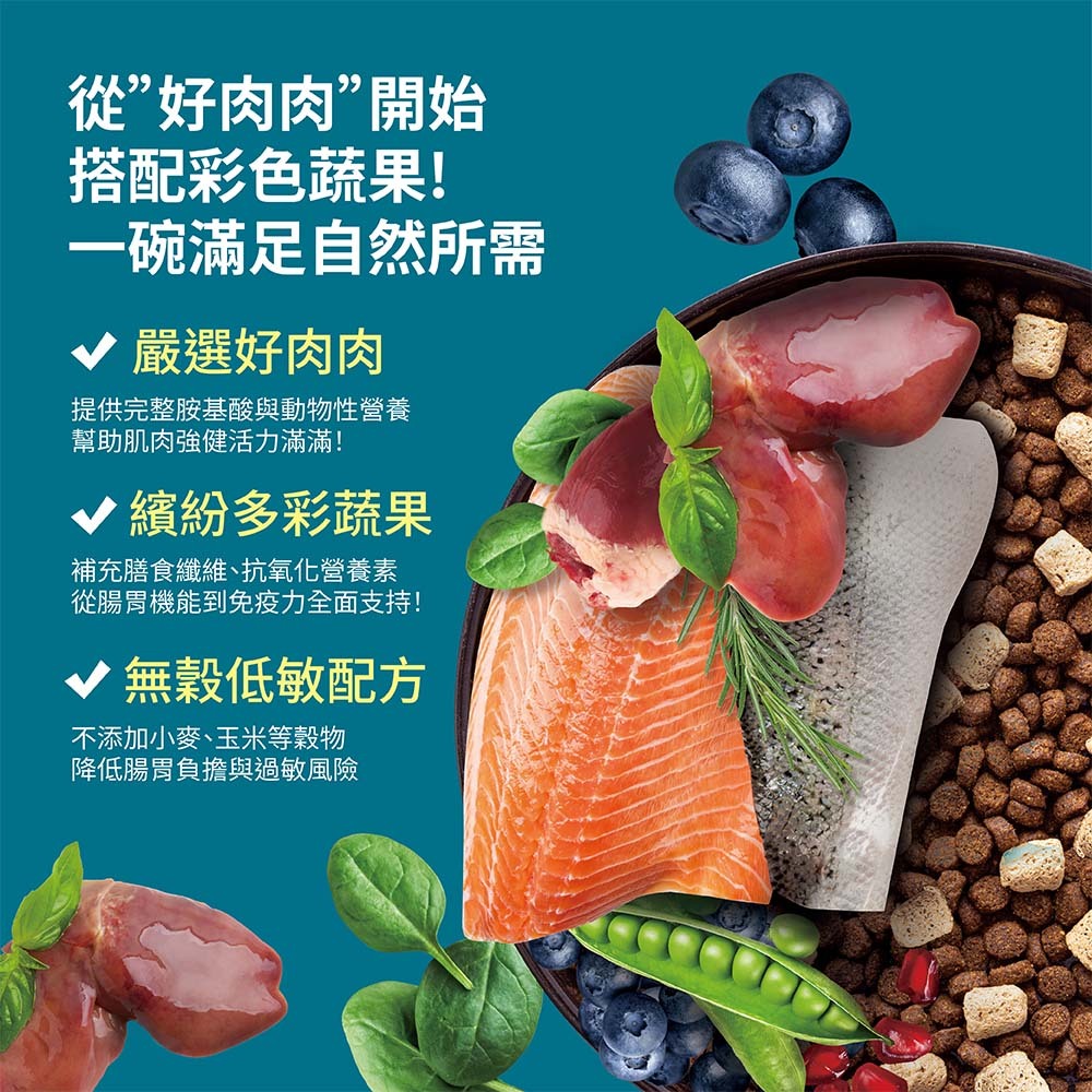 乾糧:脫水鱈魚、脫水鯡魚、脫水雞肉、脫水火雞、乾豌豆、豌豆粉、雞脂肪(以混合生育酚保存)、新鮮火雞肉、亞麻籽粉、乾扁豆、乾甜菜漿、天然香料、乾燥番茄粕、啤酒酵母、氯化鈉、牛磺酸、礦物質(硫酸鋅、硫酸亞鐵、硫酸銅、氧化錳、亞硒酸鈉、碘酸鈣、鐵蛋白、鋅蛋白、錳蛋白、銅蛋白)、維生素(維生素 E、維生素 B3、維生素 B12、維生素 B1、泛酸鈣、維生素 A、生物素、維生素 B6、核黃素、維生素 D3、葉酸)、氯化膽鹼、菊糖、氯化鉀、DL-蛋氨酸、乾菠菜、乾胡蘿蔔、乾蘋果、乾蔓越莓、乾石榴、乾藍莓、絲蘭提取物、葡萄糖胺鹽酸鹽、軟骨素硫酸鹽、薑黃、迷迭香提取物、BC30TM 芽孢乳酸菌、嗜酸乳桿菌、乾酪乳桿菌、植物乳桿菌、腸球F菌。