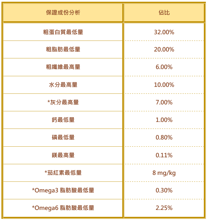 乾燥雞肉,研磨玉米,研磨糙米,玉米麩粉,雞脂(以混合生育酚保存),乾燥甜菜根,纖維素粉,天然調味料,乾燥雞蛋,研磨亞麻籽,氯化鉀,乾燥蕃茄粕,釀造乾燥酵母,食鹽,研磨藜麥,磷酸氫鈣,DL-甲硫氨酸,維生素(維生素E、菸鹼酸(維生素B3)、硫胺素(維生素B1)、泛酸鈣(維生素B5)、維生素A、鹽酸吡哆醇(維生素B6)、維生素B2、維生素D3、維生素B12、葉酸、生物素),碳酸鈣,礦物質(硫酸鋅、硫酸鐵、硫酸銅、氧化錳、亞硒酸鈉、碘酸鈣、鐵蛋白、鋅蛋白、錳蛋白、銅蛋白),乾燥蕃茄,氯化膽鹼,乾燥菊苣根(菊苣多醣、果寡糖來源),牛磺酸,絲蘭萃取精華,L-抗壞血酸-2-聚磷酸鹽(維生素C活性來源),啤酒酵母萃取物,益生菌(腸球菌,嗜酸乳桿菌,黑麴菌,長枝木黴菌,枯草芽孢桿菌)。