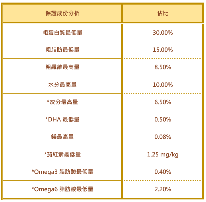 乾燥雞肉,研磨糙米,雞脂(以混合生育酚保存),玉米麩粉,研磨玉米,纖維素粉,天然調味料,雞肉,乾燥甜菜根,乾燥雞蛋,研磨亞麻籽,氯化鉀,乾燥蕃茄粕,釀造乾燥酵母,食鹽,藜麥,磷酸氫鈣,DL-甲硫氨酸,維生素(維生素E、菸鹼酸(維生素B3)、硫胺素(維生素B1)、泛酸鈣(維生素B5)、維生素A、鹽酸吡哆醇(維生素B6)、維生素B2、維生素D3、維生素B12、葉酸、生物素),碳酸鈣,礦物質(硫酸鋅、硫酸鐵、硫酸銅、氧化錳、亞硒酸鈉、碘酸鈣、鐵蛋白、鋅蛋白、錳蛋白、銅蛋白),乾燥蕃茄,氯化膽鹼,乾燥菊苣根(菊苣多醣、果寡糖來源),牛磺酸,蕬蘭萃取精華,L-抗壞血酸-2-聚磷酸鹽(維生素C活性來源),啤酒酵母萃取物,益生菌(腸球菌,嗜酸乳桿菌,黑麴菌,長枝木黴菌,枯草芽孢桿菌)。